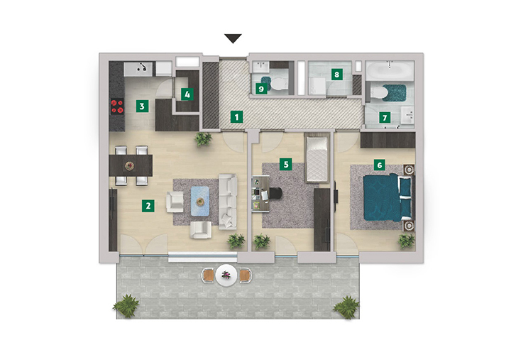Az adatlapon megjelölt alaprajzi méretek vakolatlan falak közötti méretek, a kivitelezés során kismértékű méretváltozás lehetséges. Ezen dokumentációban közölt adatok a kiviteli tervek alapján kerültek megállapításra kizárólag tájékoztató jelleggel, nem minősülnek ajánlattételnek. Az alaprajzon feltüntetett bútorok tájékoztató jellegűek, azok rajzi elhelyezése nem feltétlenül tükrözi azok jövőbeni elhelyezhetőségét, illetve azok nem képzik a lakás részét.
