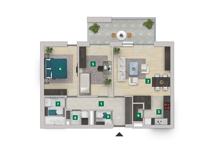 Az adatlapon megjelölt alaprajzi méretek vakolatlan falak közötti méretek, a kivitelezés során kismértékű méretváltozás lehetséges. Ezen dokumentációban közölt adatok a kiviteli tervek alapján kerültek megállapításra kizárólag tájékoztató jelleggel, nem minősülnek ajánlattételnek. Az alaprajzon feltüntetett bútorok tájékoztató jellegűek, azok rajzi elhelyezése nem feltétlenül tükrözi azok jövőbeni elhelyezhetőségét, illetve azok nem képzik a lakás részét.