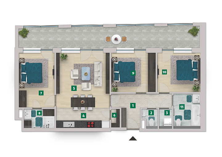 Az adatlapon megjelölt alaprajzi méretek vakolatlan falak közötti méretek, a kivitelezés során kismértékű méretváltozás lehetséges. Ezen dokumentációban közölt adatok a kiviteli tervek alapján kerültek megállapításra kizárólag tájékoztató jelleggel, nem minősülnek ajánlattételnek. Az alaprajzon feltüntetett bútorok tájékoztató jellegűek, azok rajzi elhelyezése nem feltétlenül tükrözi azok jövőbeni elhelyezhetőségét, illetve azok nem képzik a lakás részét.