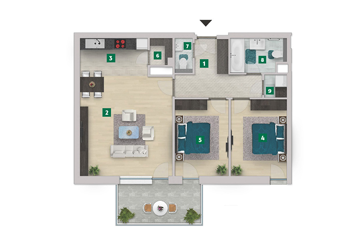 Az adatlapon megjelölt alaprajzi méretek vakolatlan falak közötti méretek, a kivitelezés során kismértékű méretváltozás lehetséges. Ezen dokumentációban közölt adatok a kiviteli tervek alapján kerültek megállapításra kizárólag tájékoztató jelleggel, nem minősülnek ajánlattételnek. Az alaprajzon feltüntetett bútorok tájékoztató jellegűek, azok rajzi elhelyezése nem feltétlenül tükrözi azok jövőbeni elhelyezhetőségét, illetve azok nem képzik a lakás részét.