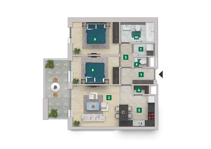 Az adatlapon megjelölt alaprajzi méretek vakolatlan falak közötti méretek, a kivitelezés során kismértékű méretváltozás lehetséges. Ezen dokumentációban közölt adatok a kiviteli tervek alapján kerültek megállapításra kizárólag tájékoztató jelleggel, nem minősülnek ajánlattételnek. Az alaprajzon feltüntetett bútorok tájékoztató jellegűek, azok rajzi elhelyezése nem feltétlenül tükrözi azok jövőbeni elhelyezhetőségét, illetve azok nem képzik a lakás részét.
