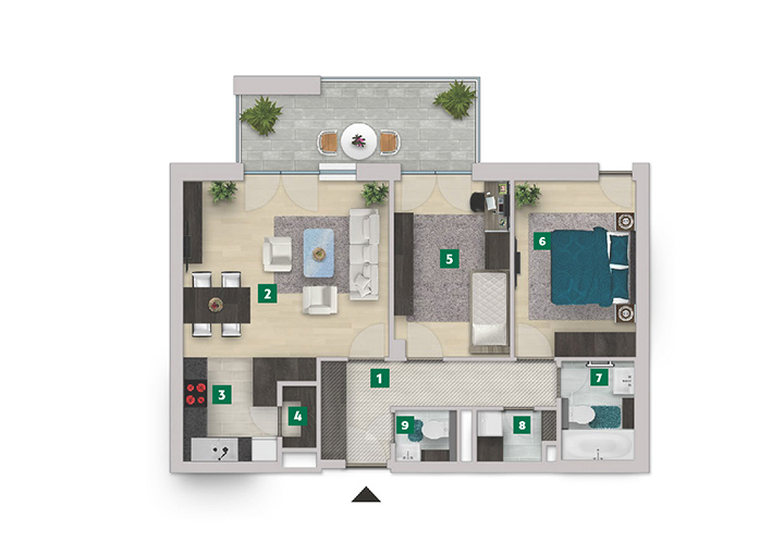 Az adatlapon megjelölt alaprajzi méretek vakolatlan falak közötti méretek, a kivitelezés során kismértékű méretváltozás lehetséges. Ezen dokumentációban közölt adatok a kiviteli tervek alapján kerültek megállapításra kizárólag tájékoztató jelleggel, nem minősülnek ajánlattételnek. Az alaprajzon feltüntetett bútorok tájékoztató jellegűek, azok rajzi elhelyezése nem feltétlenül tükrözi azok jövőbeni elhelyezhetőségét, illetve azok nem képzik a lakás részét.