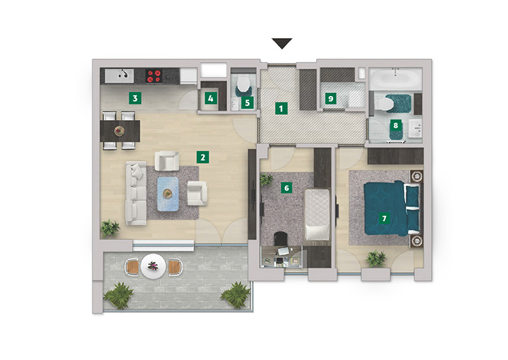 Az adatlapon megjelölt alaprajzi méretek vakolatlan falak közötti méretek, a kivitelezés során kismértékű méretváltozás lehetséges. Ezen dokumentációban közölt adatok a kiviteli tervek alapján kerültek megállapításra kizárólag tájékoztató jelleggel, nem minősülnek ajánlattételnek. Az alaprajzon feltüntetett bútorok tájékoztató jellegűek, azok rajzi elhelyezése nem feltétlenül tükrözi azok jövőbeni elhelyezhetőségét, illetve azok nem képzik a lakás részét.