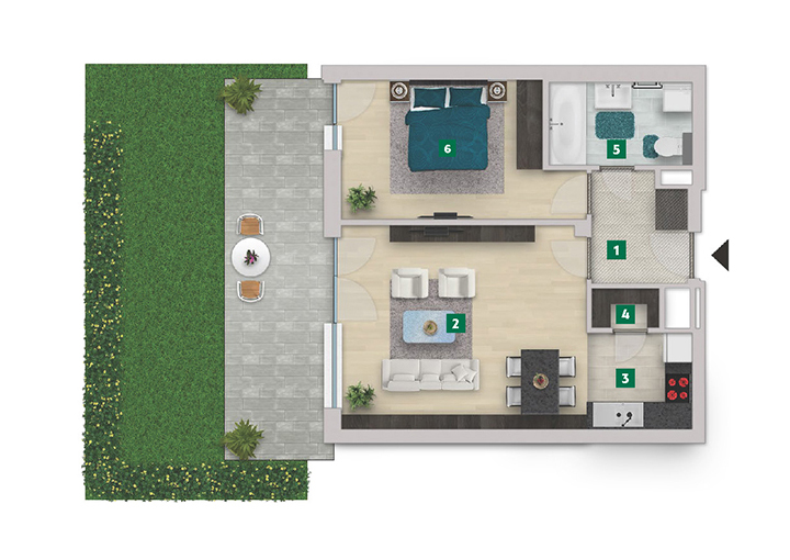 Az adatlapon megjelölt alaprajzi méretek vakolatlan falak közötti méretek, a kivitelezés során kismértékű méretváltozás lehetséges. Ezen dokumentációban közölt adatok a kiviteli tervek alapján kerültek megállapításra kizárólag tájékoztató jelleggel, nem minősülnek ajánlattételnek. Az alaprajzon feltüntetett bútorok tájékoztató jellegűek, azok rajzi elhelyezése nem feltétlenül tükrözi azok jövőbeni elhelyezhetőségét, illetve azok nem képzik a lakás részét.