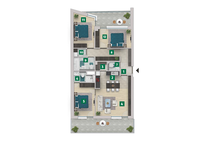 Az adatlapon megjelölt alaprajzi méretek vakolatlan falak közötti méretek, a kivitelezés során kismértékű méretváltozás lehetséges. Ezen dokumentációban közölt adatok a kiviteli tervek alapján kerültek megállapításra kizárólag tájékoztató jelleggel, nem minősülnek ajánlattételnek. Az alaprajzon feltüntetett bútorok tájékoztató jellegűek, azok rajzi elhelyezése nem feltétlenül tükrözi azok jövőbeni elhelyezhetőségét, illetve azok nem képzik a lakás részét.