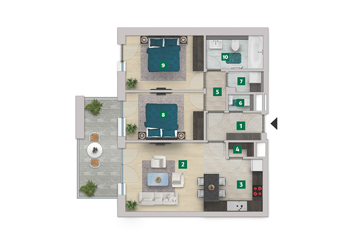 Az adatlapon megjelölt alaprajzi méretek vakolatlan falak közötti méretek, a kivitelezés során kismértékű méretváltozás lehetséges. Ezen dokumentációban közölt adatok a kiviteli tervek alapján kerültek megállapításra kizárólag tájékoztató jelleggel, nem minősülnek ajánlattételnek. Az alaprajzon feltüntetett bútorok tájékoztató jellegűek, azok rajzi elhelyezése nem feltétlenül tükrözi azok jövőbeni elhelyezhetőségét, illetve azok nem képzik a lakás részét.