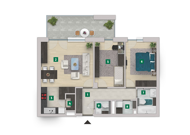Az adatlapon megjelölt alaprajzi méretek vakolatlan falak közötti méretek, a kivitelezés során kismértékű méretváltozás lehetséges. Ezen dokumentációban közölt adatok a kiviteli tervek alapján kerültek megállapításra kizárólag tájékoztató jelleggel, nem minősülnek ajánlattételnek. Az alaprajzon feltüntetett bútorok tájékoztató jellegűek, azok rajzi elhelyezése nem feltétlenül tükrözi azok jövőbeni elhelyezhetőségét, illetve azok nem képzik a lakás részét.
