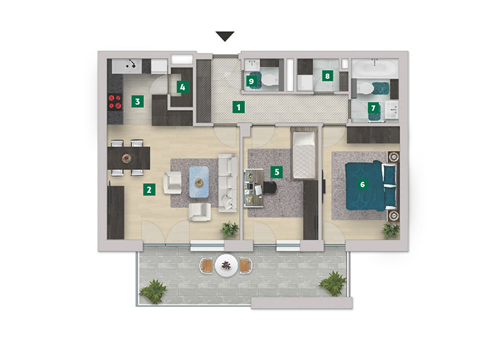 Az adatlapon megjelölt alaprajzi méretek vakolatlan falak közötti méretek, a kivitelezés során kismértékű méretváltozás lehetséges. Ezen dokumentációban közölt adatok a kiviteli tervek alapján kerültek megállapításra kizárólag tájékoztató jelleggel, nem minősülnek ajánlattételnek. Az alaprajzon feltüntetett bútorok tájékoztató jellegűek, azok rajzi elhelyezése nem feltétlenül tükrözi azok jövőbeni elhelyezhetőségét, illetve azok nem képzik a lakás részét.