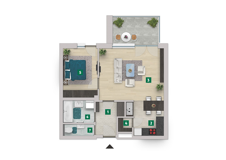 Az adatlapon megjelölt alaprajzi méretek vakolatlan falak közötti méretek, a kivitelezés során kismértékű méretváltozás lehetséges. Ezen dokumentációban közölt adatok a kiviteli tervek alapján kerültek megállapításra kizárólag tájékoztató jelleggel, nem minősülnek ajánlattételnek. Az alaprajzon feltüntetett bútorok tájékoztató jellegűek, azok rajzi elhelyezése nem feltétlenül tükrözi azok jövőbeni elhelyezhetőségét, illetve azok nem képzik a lakás részét.