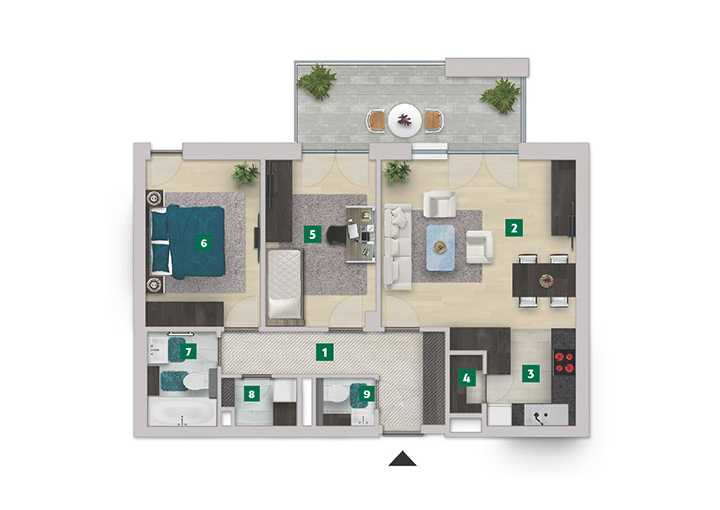 Az adatlapon megjelölt alaprajzi méretek vakolatlan falak közötti méretek, a kivitelezés során kismértékű méretváltozás lehetséges. Ezen dokumentációban közölt adatok a kiviteli tervek alapján kerültek megállapításra kizárólag tájékoztató jelleggel, nem minősülnek ajánlattételnek. Az alaprajzon feltüntetett bútorok tájékoztató jellegűek, azok rajzi elhelyezése nem feltétlenül tükrözi azok jövőbeni elhelyezhetőségét, illetve azok nem képzik a lakás részét.